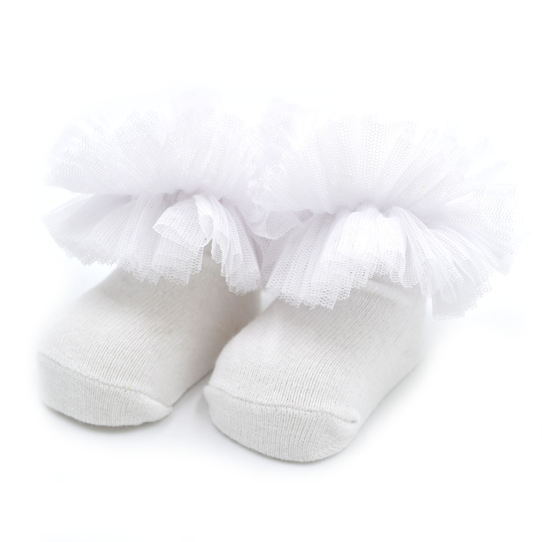 Καλτσάκια κοντά με φρου – φρου από τούλι στο πάνω μέρος σε λευκό απόχρωση. Ιδανικά για ηλικίες 0-1 ετών.